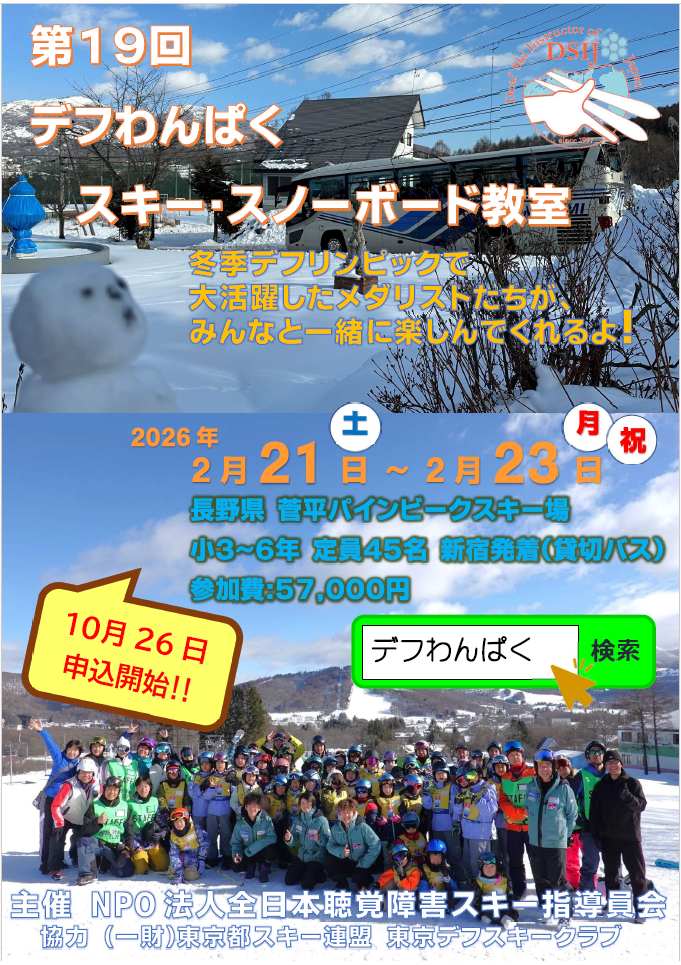 来年1月に予定していましたデフわんぱくスキースノーボード教室は、新型コロナウィルスの感染拡大防止のため、今年度も中止することに決定いたしました。大変申し訳ございません。