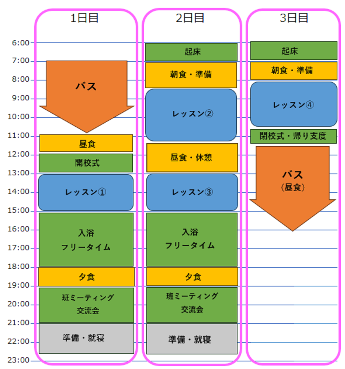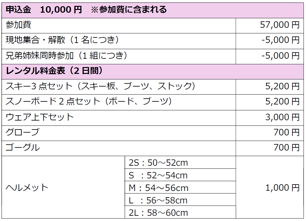 2泊7食(朝2・昼3・夕2) おやつ代 講習料 リフト代 往復バス代